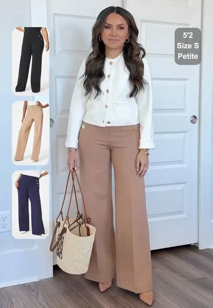 Αυτό το φαρδύ παντελόνι που πλένεται στο πλυντήριο είναι κατασκευασμένο από λείο premium ponte ύφασμα με άνετη εφαρμογή με κορδόνι και χρυσά διακοσμητικά κουμπιά.